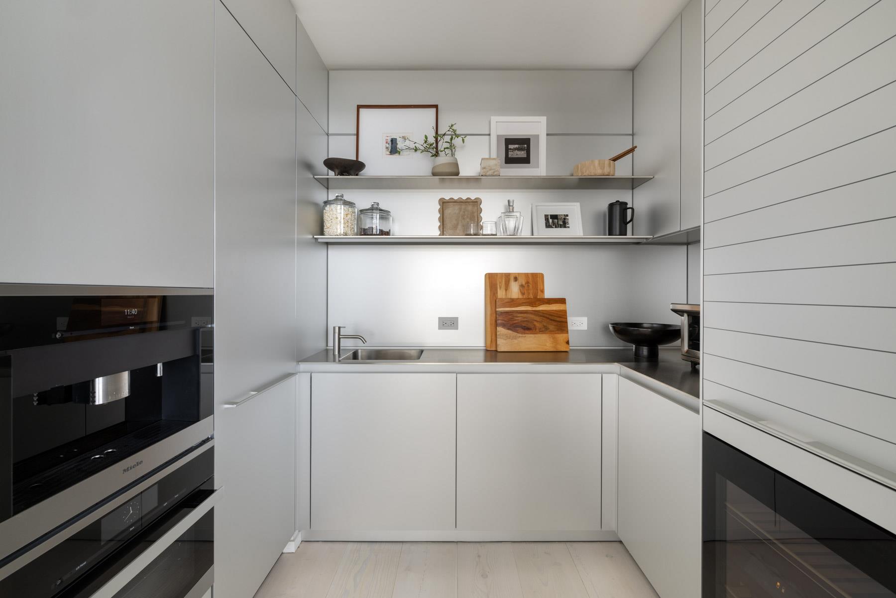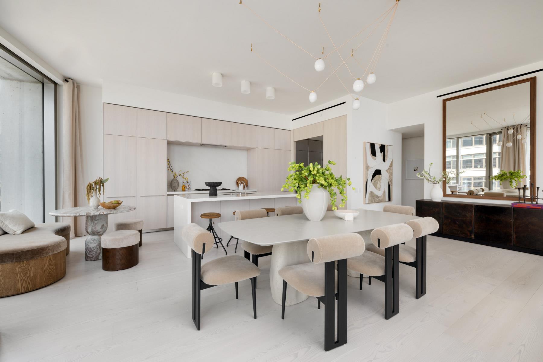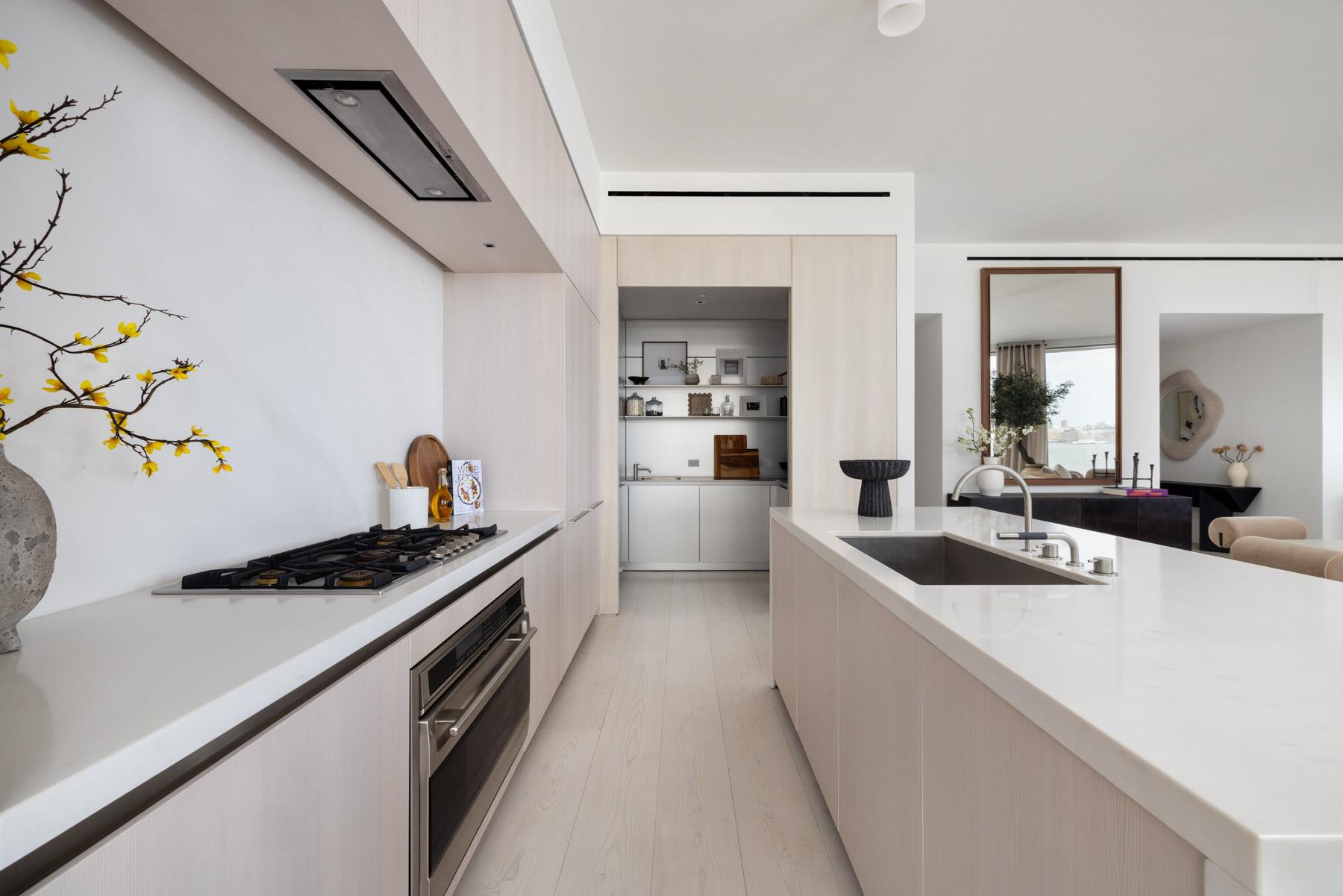 Enter through the foyer and into the Great Room, which flows into a custom designed Bulthaup kitchen finished with Scandinavian Larch cabinetry, hand-selected Sivec marble, a suite of integrated appliances by Sub-Zero, Wolf, Gaggenau, and Miele, and a separate enclosed chef’s kitchen with a Sub-Zero freezer and wine refrigerator, and Wolf steam oven. Beyond the kitchen is a dramatic interior hallway leading to two bedrooms with northern exposures and en suite baths, and a separate door to the exterior hallway to maximize privacy.