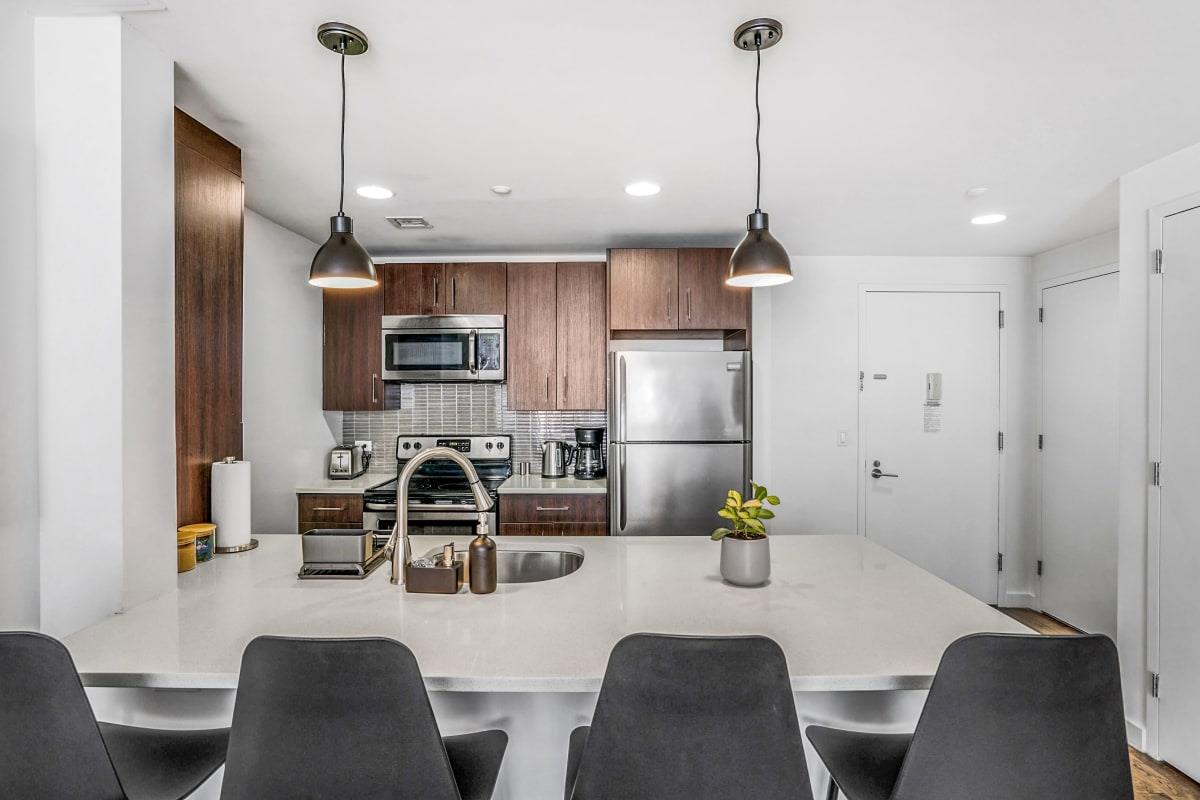 Catering kitchen with ice-maker, dishwasher, wine chiller, and bar seating