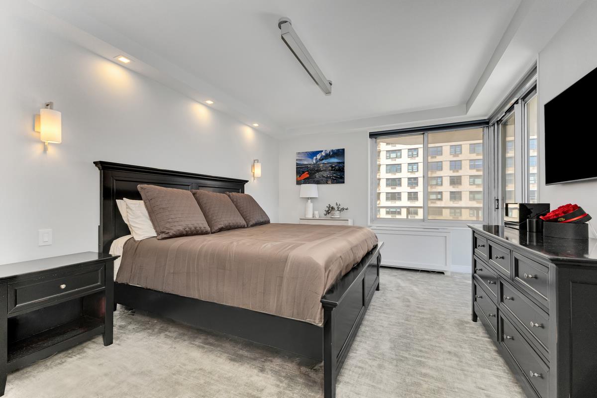 The windowed kitchen is well-appointed with selenite countertops, a Sub-Zero refrigerator, Viking range, Bosch dishwasher, and ample cabinetry. A full-size Bosch Washer and Dryer adds a level of convenience not often found in similar apartments.