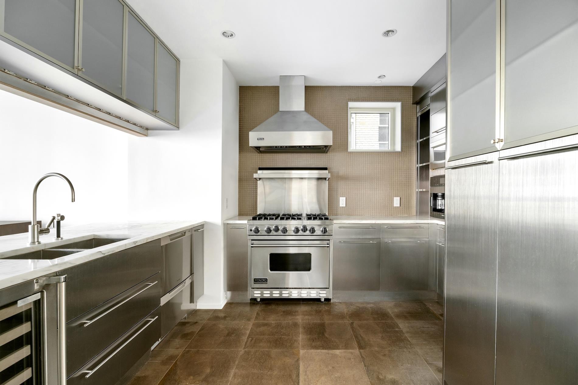 Functional and striking, the windowed chef's kitchen is designed for effortless hosting, featuring Grey Foussana limestone floors and countertops, custom brushed stainless cabinetry, and back-lit frosted glass accents, a six-burner Viking range with a vent hood and warming shelf, Sub-Zero refrigerator, Viking wine cooler, and a built-in Miele espresso maker.