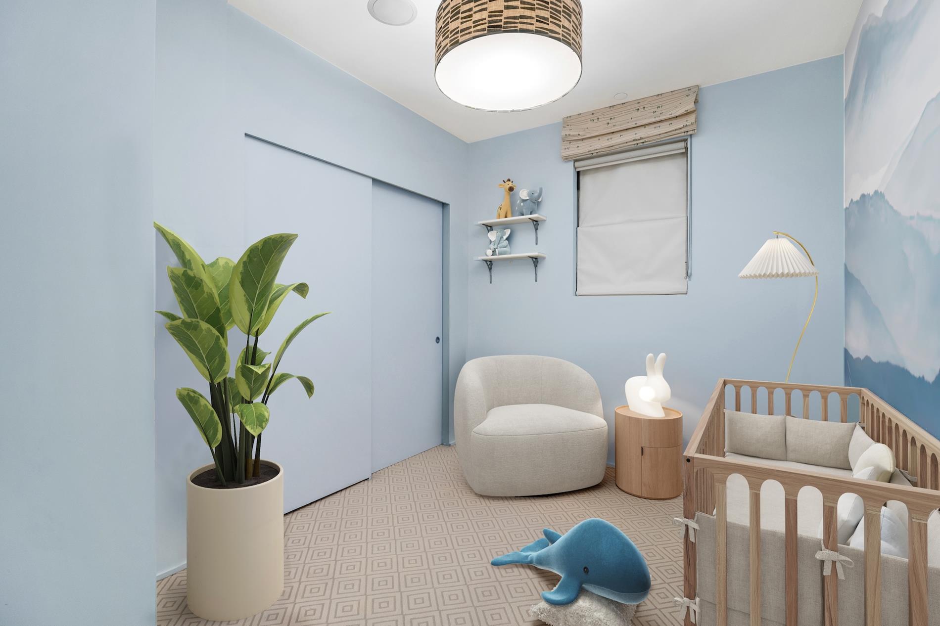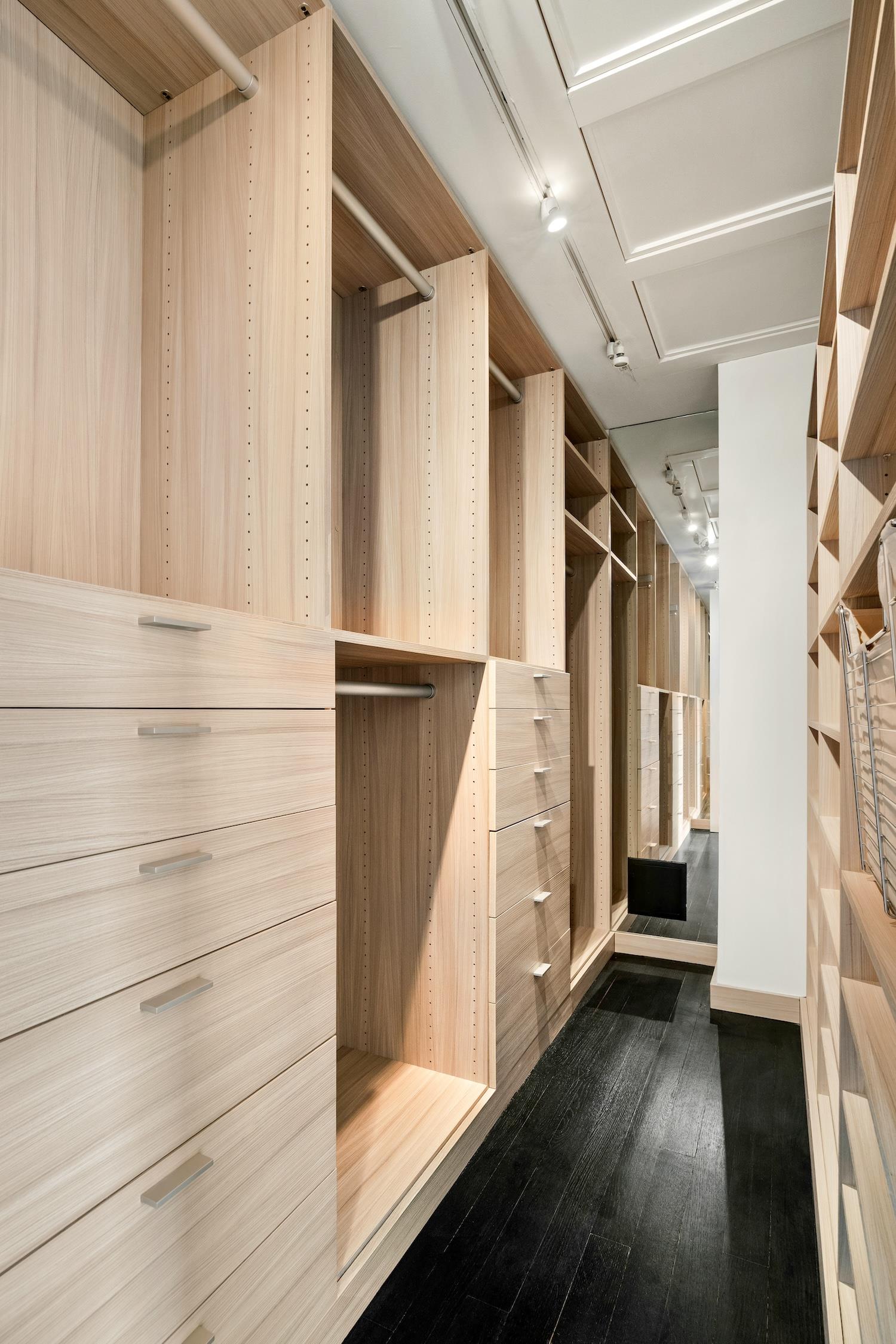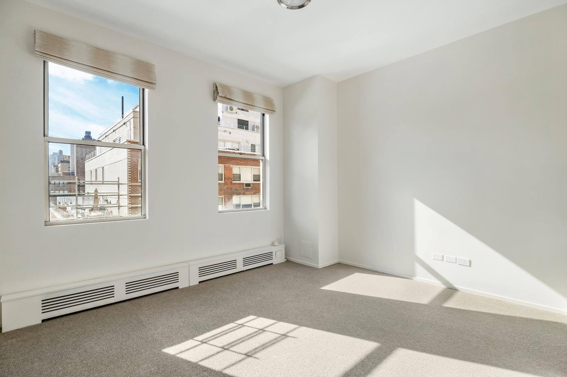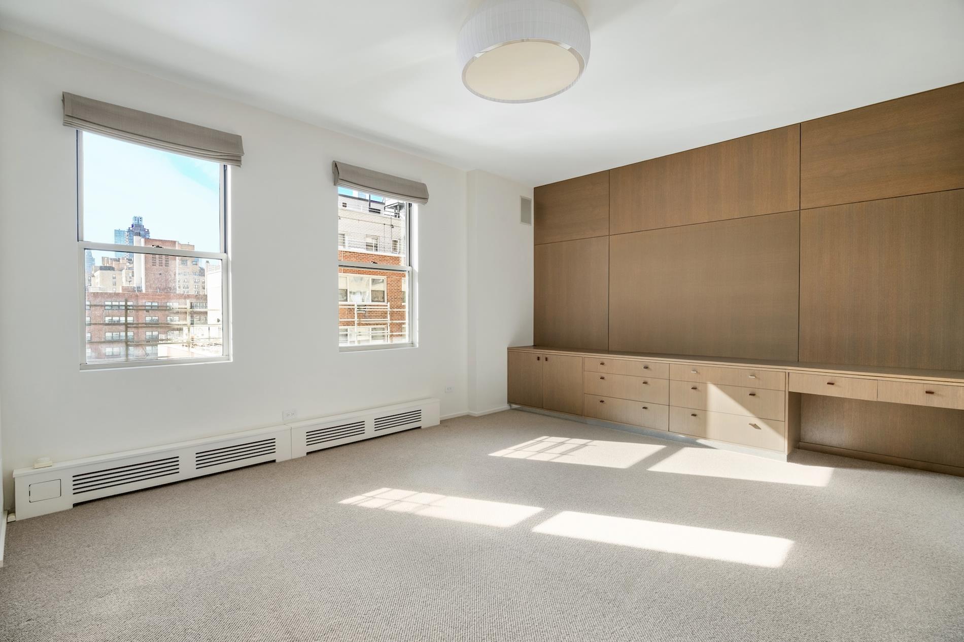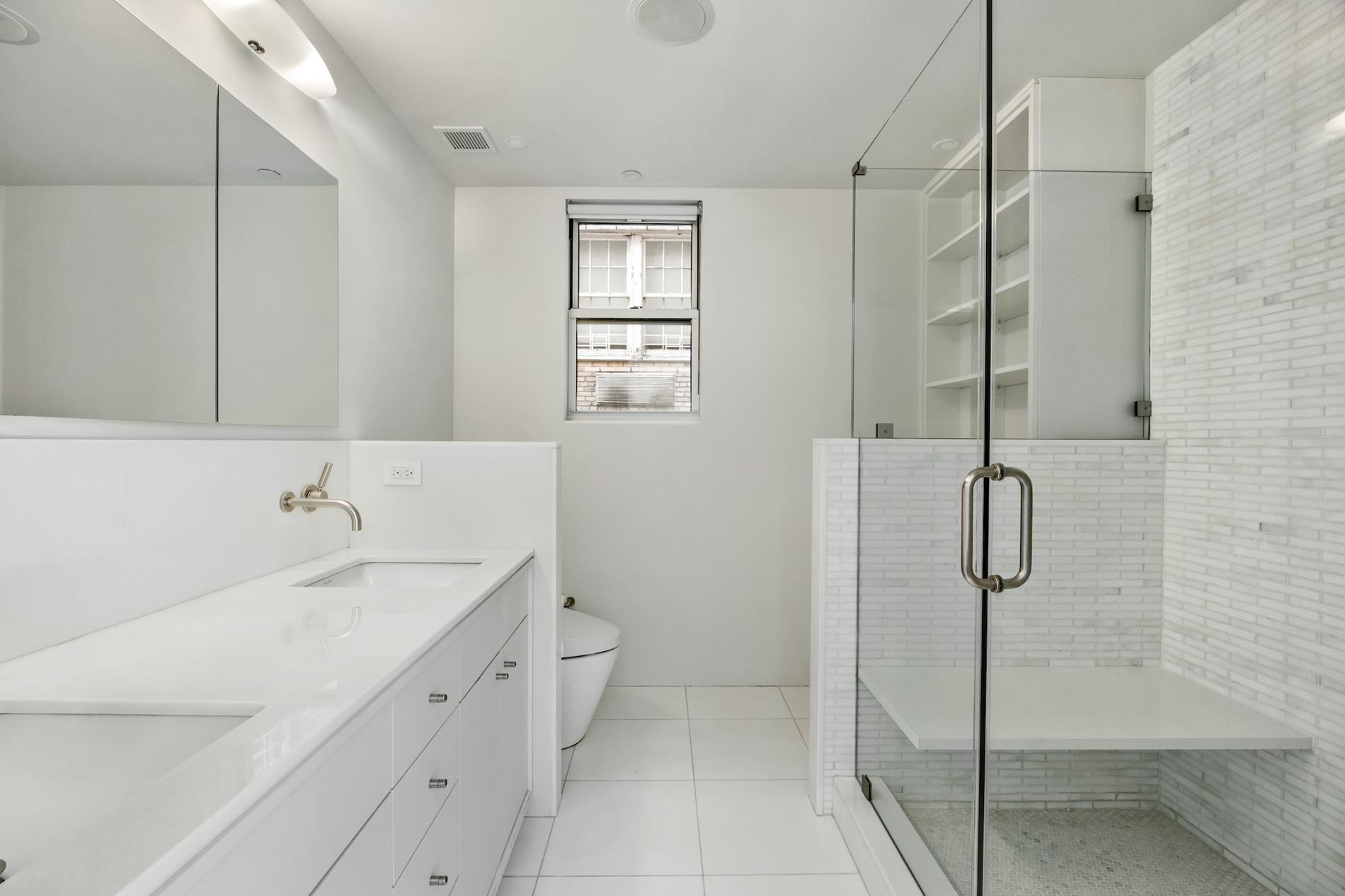 The primary bedroom suite boasts southern exposures, a marble shower adorned with Anne Sacks tile and a custom vanity, and two closets including one that is both exceptionally large (11' x 5') and custom designed. Two additional bedrooms provide flexibility for guests or home office use, one enjoying bright southern exposures, open city views, and an en-suite bath with Kallista fixtures.